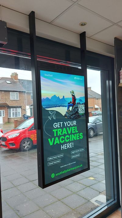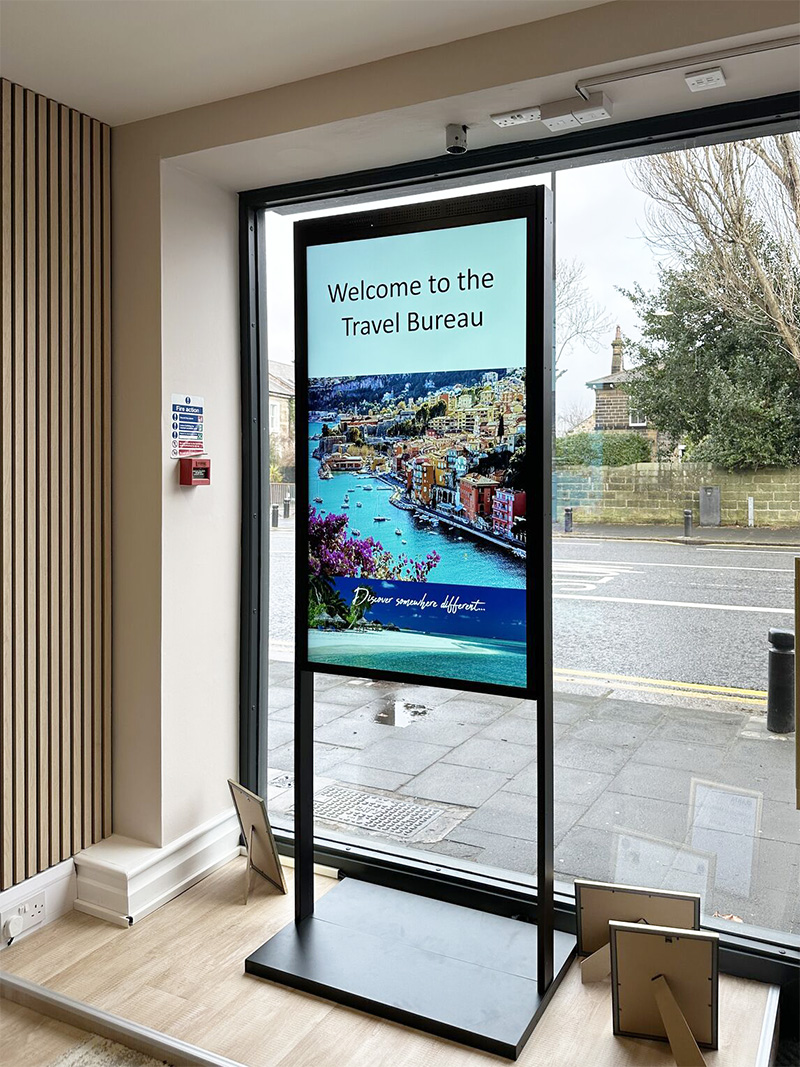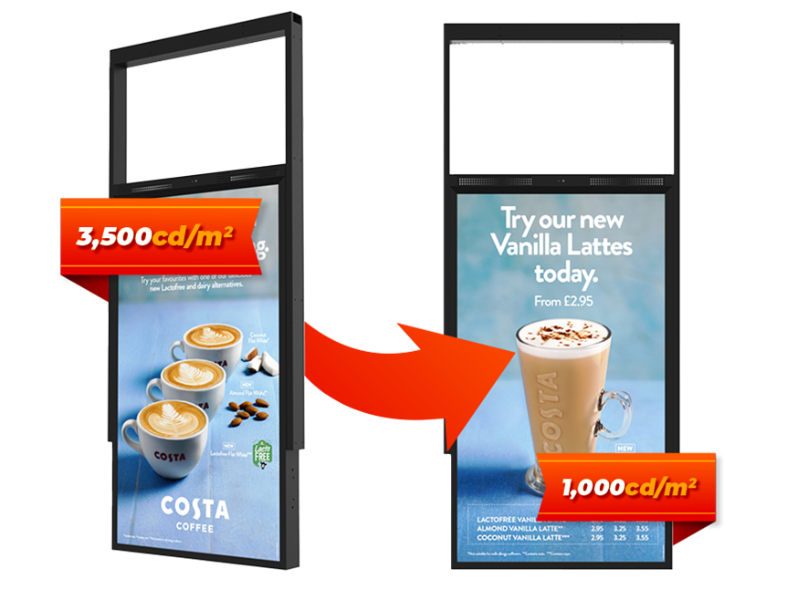 Avec un écran de 3 500cd/m2 orienté vers l’extérieur pour lutter contre la lumière directe du soleil et un écran de 1 000cd/m2 orienté vers l’intérieur pour lutter contre les éclairages intenses, ces écrans double face sont conçus pour les vitrines. De plus, ils sont ultra-résistants aux défauts de noircissement jusqu’à 110°C.